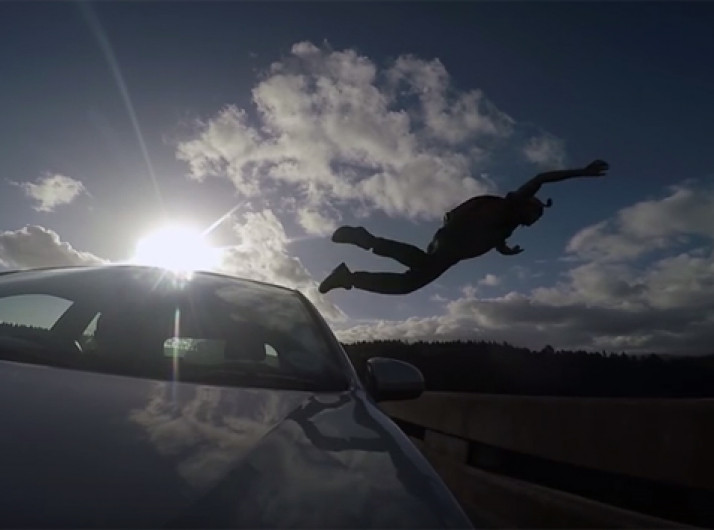 Base jumper faz salto espetacular de carro em movimento sobre ponte