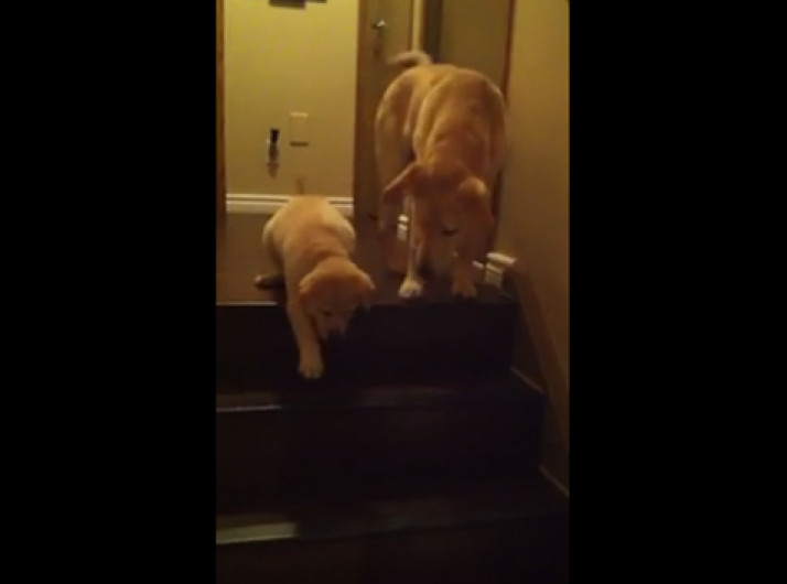 Cachorro adulto ajuda filhote a descer as escadas pela primeira vez