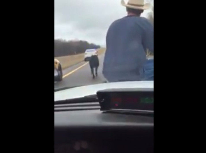 Vaqueiro sobe em viatura da polícia para laçar bezerro que havia fugido