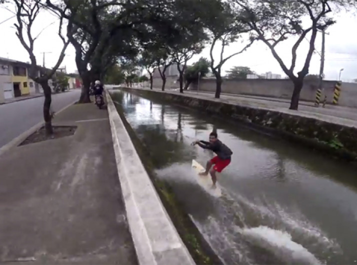 Jovem se arrisca surfando dentro de canal de Santos e vídeo viraliza