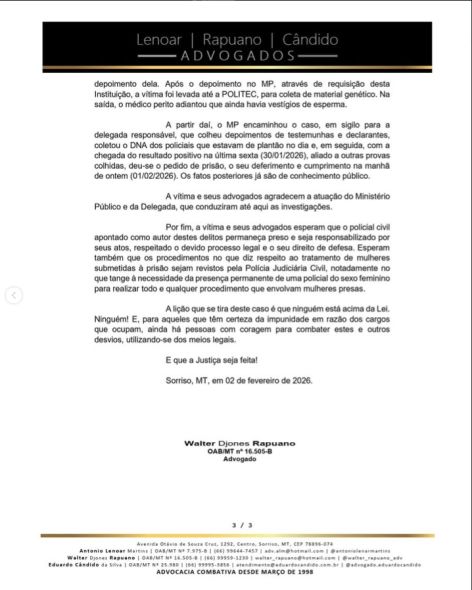 "A vítima e seus advogados esperam que o policial civil apontado como autor destes delitos permaneça preso e seja responsabilizado por seus atos, respeitado o devido processo legal e o seu direito de defesa. Esperam também que os procedimentos no que diz respeito ao tratamento de mulheres submetidas à prisão sejam revistos pela Polícia Judiciária Civil, notadamente no que tange à necessidade da presença permanente de uma policial do sexo feminino para realizar todo e qualquer procedimento que envolvam mulheres presas", diz outro trecho da nota.