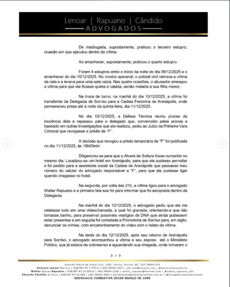Segundo o documento, a vítima foi presa temporariamente no dia 8 de dezembro e levada à delegacia de Polícia Civil de Sorriso. No dia seguinte, ela passou por audiência de custódia, na qual teve sua prisão mantida, e então foi levada para exame de corpo de delito pelo investigador acusado.