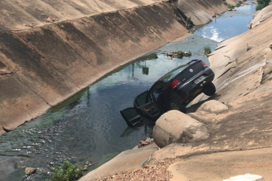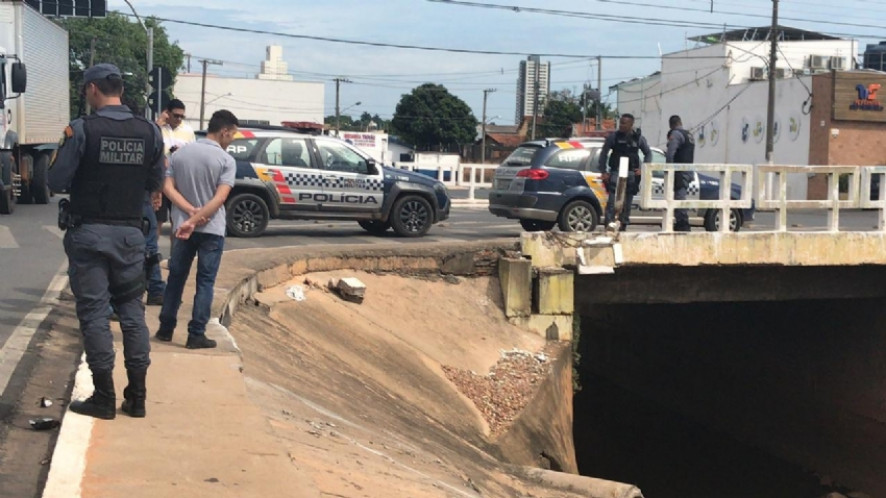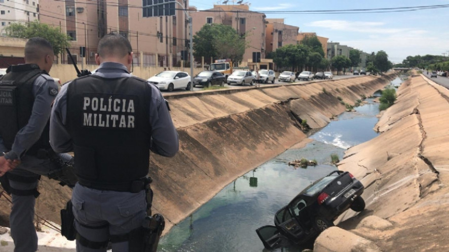 Um carro com três assaltantes caiu no Córrego Mané Pinto, durante uma perseguição na manhã desta quinta-feira (1º), na Avenida 8 de Abril, em Cuiabá.