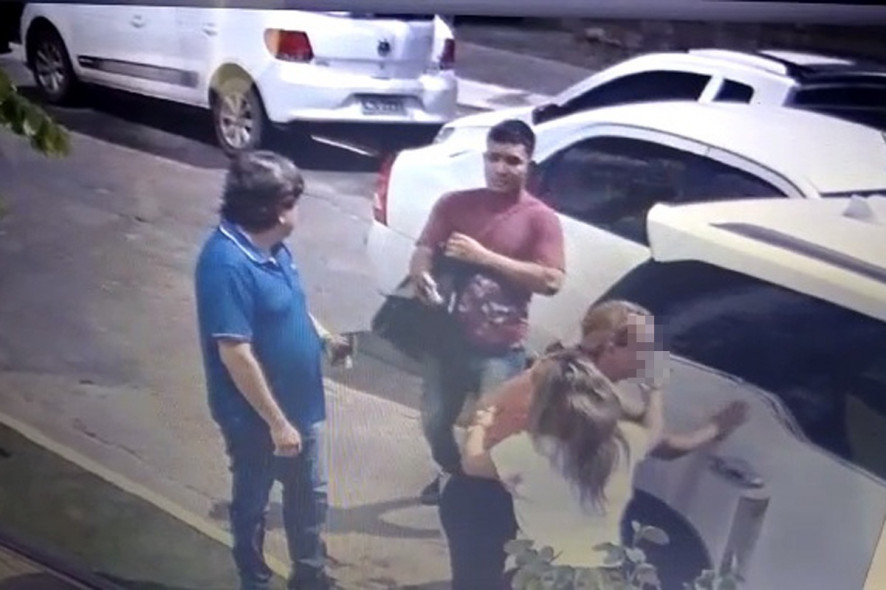 No vídeo, é possível ver o momento em que um criminoso armado aborda um grupo de três pessoas e exige a chave do carro, um Toyota SW4 branco.