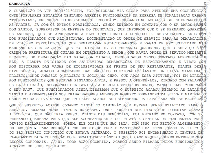 Segundo o supervisor da empresa, Fernando se apresentou como dono do Choppão e exigiu dos funcionários a ordem de serviço para as demarcações. “Havia ordem de serviço mediante projetos de demarcação das vagas da cidade”, diz trecho do boletim de ocorrência.