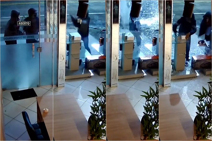 Uma câmera de segurança registrou o momento em que dois ladrões destruíram a vitrine de uma loja de eletrônicos e tentaram furtar celulares, na madrugada desta segunda-feira (13), em Nova Xavantina (a 650 quilômetros de Cuiabá).
