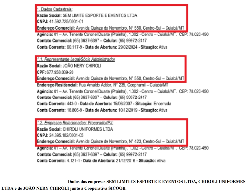“É também necessário destacar que esse é o mesmo endereço comunicado pela empresa à Cooperativa Sicoob, na qual a Sem Limite Esporte e Eventos Ltda possui conta-corrente ativa, administrada por João Nery Chiroli e que possui relação com a Chiroli Uniformes Ltda.”.
