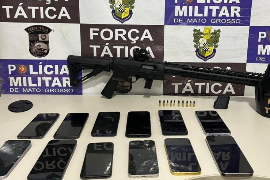 Durante buscas na residência, a equipe tática encontrou um rifle calibre .22 carregado com 10 munições, e durante busca no veículo, mais seis munições do mesmo calibre foram encontradas, além de diversos celulares.
