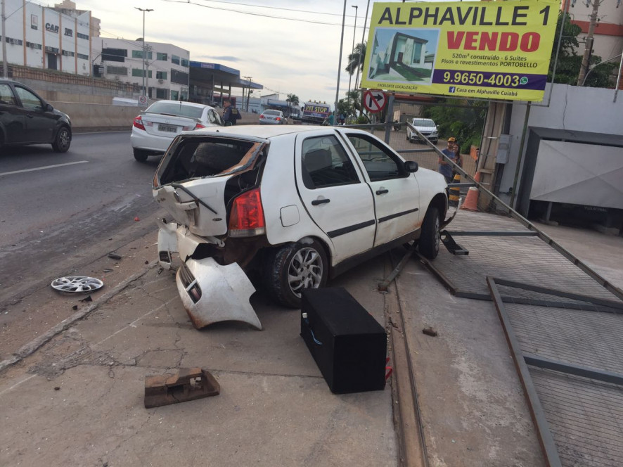 Com o impacto na traseira, o Pálio foi arremessado contra a entrada de uma marmoraria, quebrando a grade de proteção. Os dois carros ficaram bastante danificados.