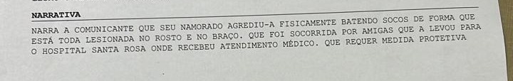 A vítima solicitou uma medida protetiva contra o namorado e o caso será investigado pela Polícia Civil.