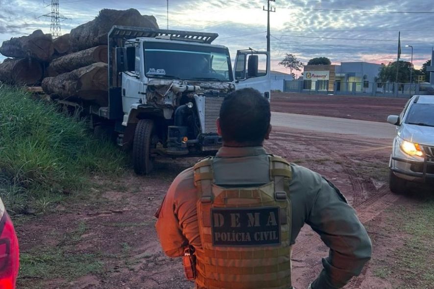 Um caminhão carregado com 10 toras gigantes de madeira ilegal, foi apreendido pela Polícia Civil, no município de Juína, durante fiscalização da Delegacia Especializada do Meio Ambiente (Dema), realizada na sexta-feira (27.2).