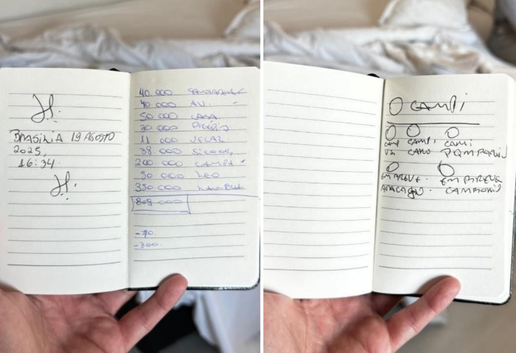 Uma caderneta de anotações foi encontrada na mala do empresário, contendo registros do que seriam valores e nomes — pouco legíveis — ao lado.