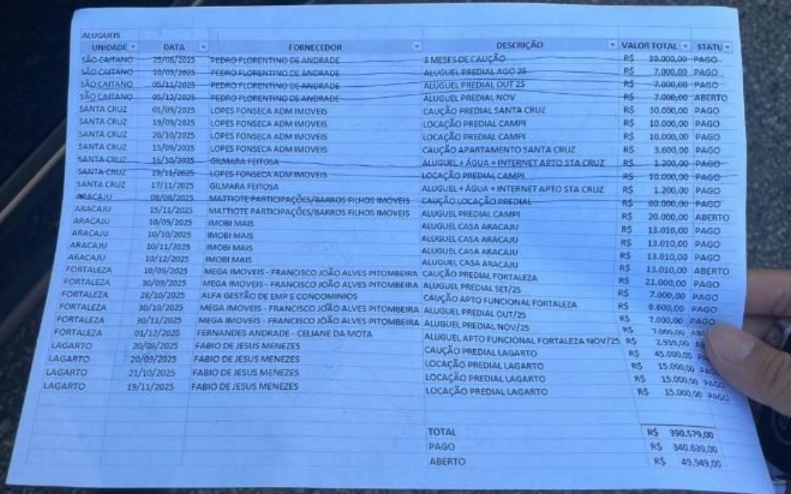 Já a planilha apresentava registros de valores relacionados ao pagamento de fornecedores nas seguintes localidades: São Caetano, Santa Cruz, Aracaju, Fortaleza e Lagarto.