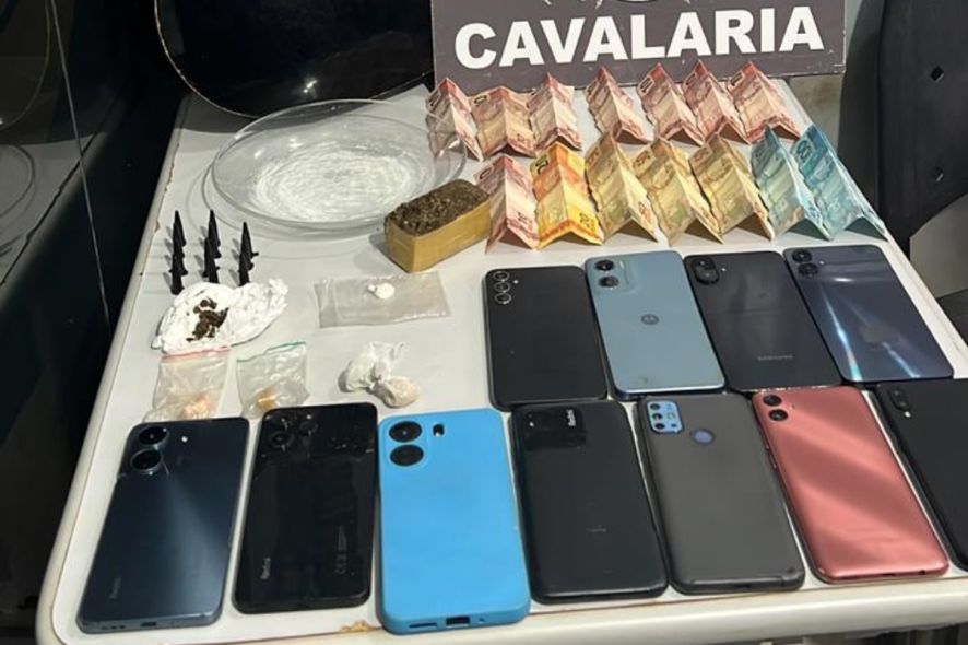 Também foram apreendidos mais R$ 270,00 em espécie, totalizando R$ 450,00, 11 aparelhos celulares de diferentes marcas e um prato com resquícios de substância análoga à cocaína, utilizado para o preparo da droga.