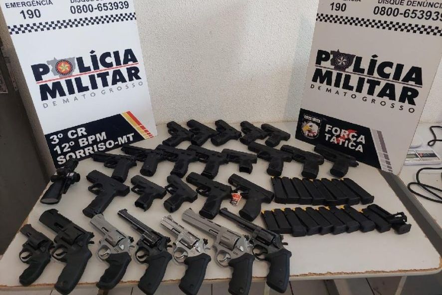 Policiais militares do 12º Batalhão localizaram 25 armas de fogo e prenderam dois homens, de 20 e 40 anos, e apreenderam uma adolescente, de 17 anos, na tarde desta quinta-feira (29.12), em Sorriso. O armamento recuperado foi furtado de uma casa de pesca.
