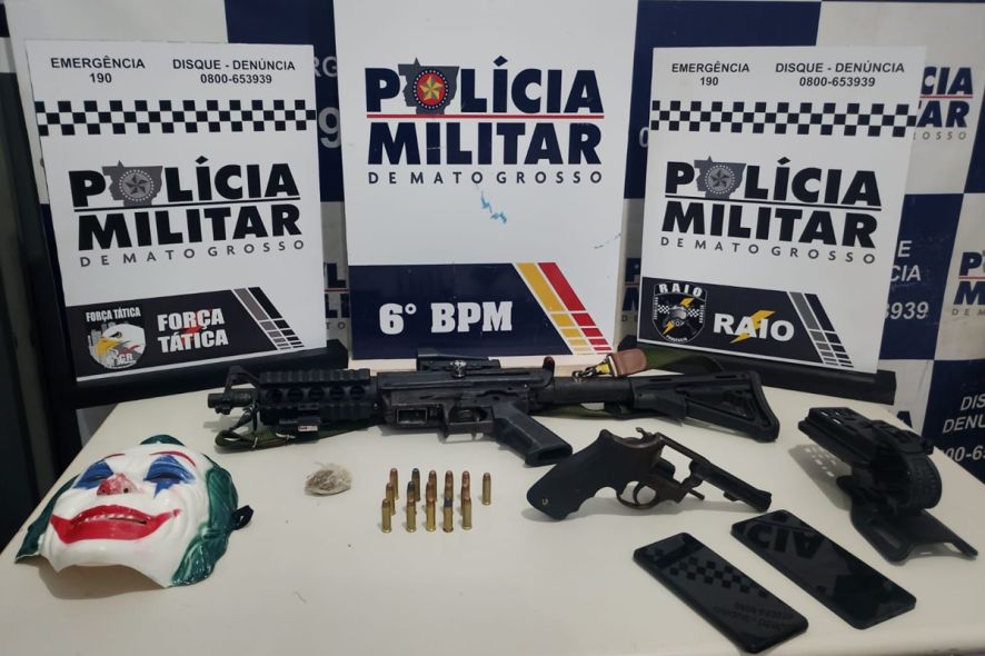 Além das duas armas de fogo e das 16 munições, os policiais apreenderam dois celulares da marca Samsung (modelos A31 e um azul), uma máscara de palhaço, uma capa de colete preta, uma gandola, uma calça e uma boina com distintivo da PMMT.