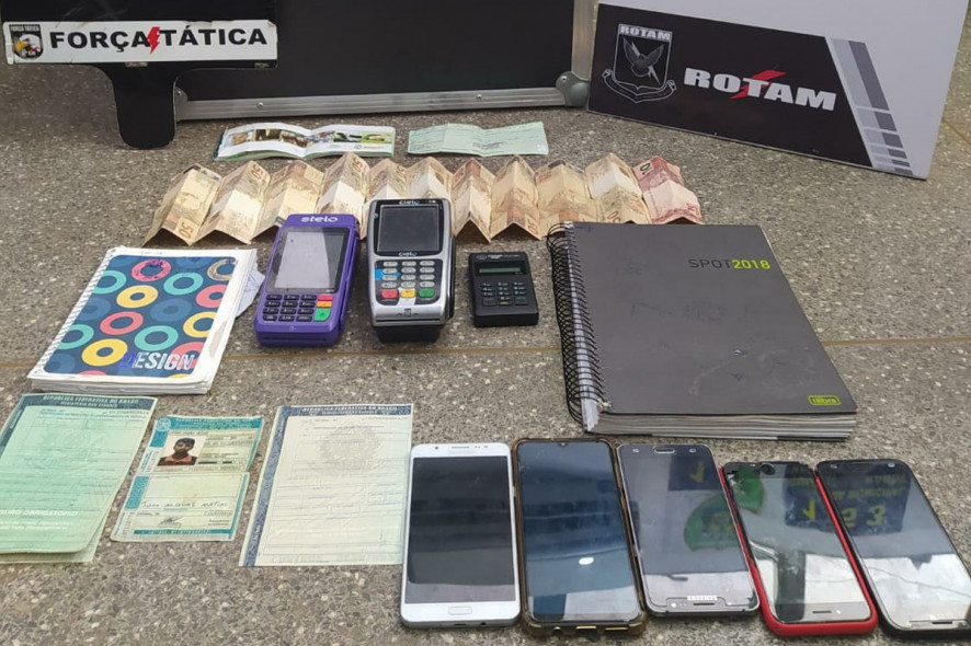 Os policiais também encontraram 10 celulares, 25 cartões de bancos, 2 máquinas de cartões, 9 munições de calibre 22.