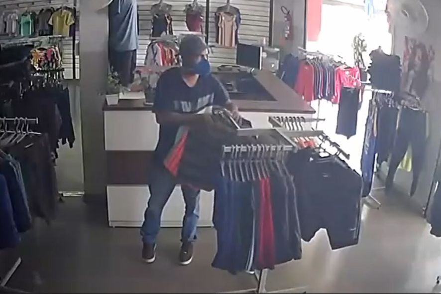 Imagens de câmeras de segurança flagraram o momento em que três homens mascarados invadiram e roubaram uma loja de roupas no bairro Jardim da Glória, em Várzea Grande, na manhã de terça-feira (2).