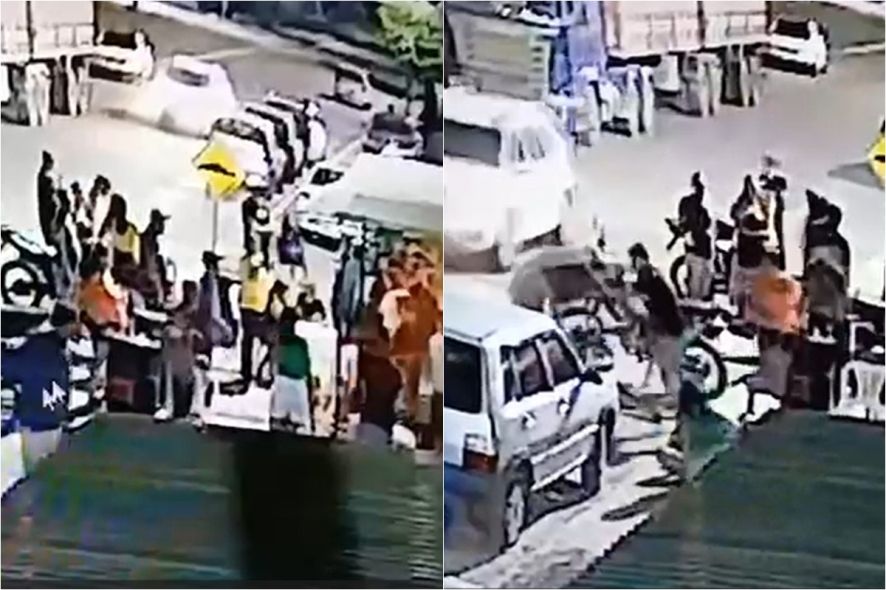 Nas imagens é possível ver que o homem chega por trás das vítimas em um bar da cidade e as ataca. A mulher percebe o suspeito quando ele se aproxima e o empurra, mas ele ainda consegue atingir Flávio.