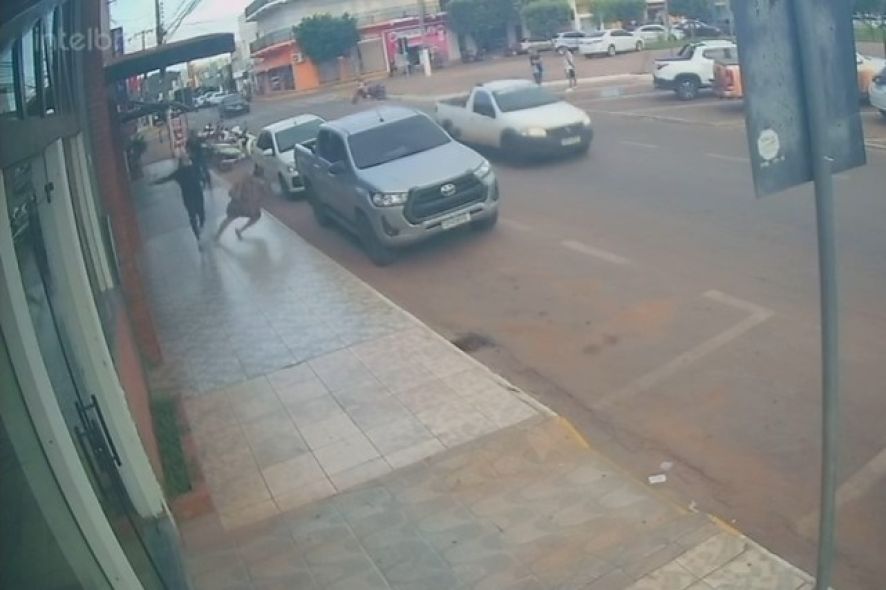 Imagens de uma câmera de videomonitoramento mostram o momento em que uma idosa, de 64 anos, é empurrada e derrubada no chão por um suspeito, enquanto saía de uma padaria, na segunda-feira (12), no município de Mirassol D’Oeste (297 km de Cuiabá).