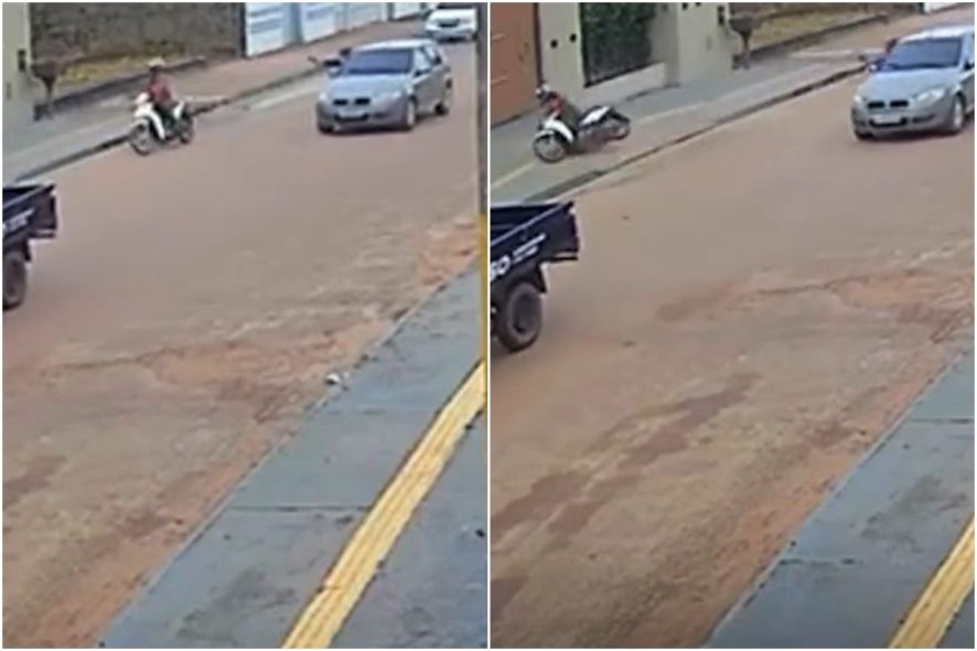 As imagens mostram José trafegando em uma motocicleta Honda Biz quando é surpreendido pelos suspeitos em um veículo Fiat Pálio.