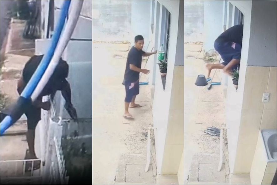 Outro registro mostra o suspeito já dentro da residência. Primeiro, ele tentou abrir a porta dos fundos, mas não conseguiu. Então, pulou a janela, que estava aberta, e destrancou a porta por dentro.