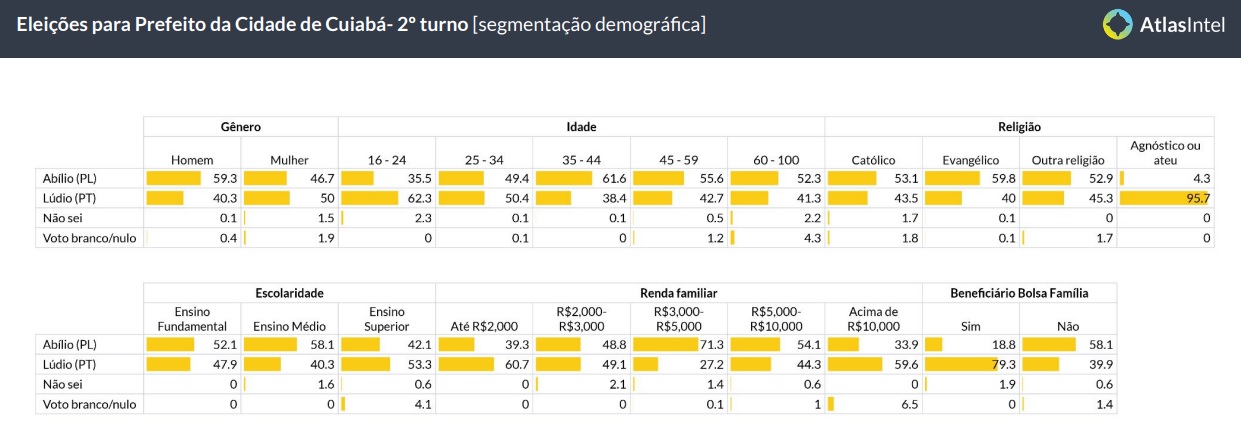 A mais recente pesquisa da AtlasIntel, divulgada nesta segunda-feira (14), apontou que o candidato Abílio Brunini (PL) tem mais votos entre os eleitores adultos e evangélicos, enquanto seu adversário Lúdio Cabral (PT) tem maior adesão entre os jovens e ateus.