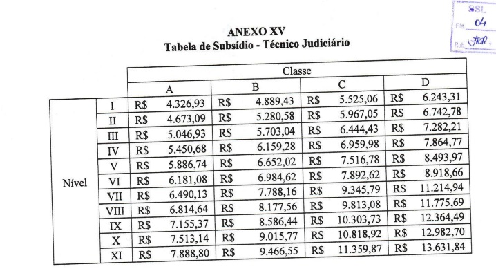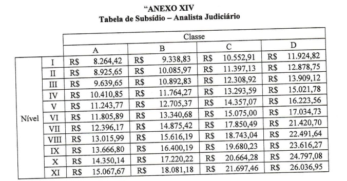 No caso do analista judiciário, as maiores classificações da carreira vão engordar o bolso dos servidores. Para quem está na classe A e no nível XI, que é o último da carreira, passará a receber R$ 15.067,67. Enquanto a classe D, com os maiores salários do Judiciário, e no nível XI, o último, receberá R$ 26.036,95. Já para quem está no início da carreira, os valores são menores (confira a tabela abaixo e a lei completa em anexo).