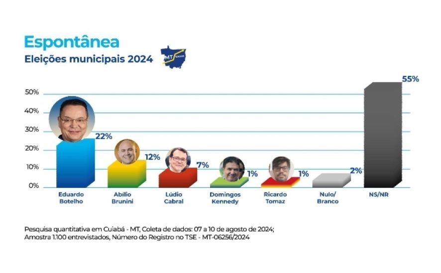 Já na modalidade espontânea, Botelho lidera com 22%, Abilio Brunini 12%, Lúdio Cabral com 7%, Kennedy e Ricardo Tomaz com 1% cada. Um total de 2% disseram votar nulo ou branco e 55% não sabem em quem votar, ou não responderam a pesquisa.