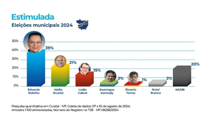 Na modalidade estimulada, Botelho chega a 39% das intenções de voto, Abilio Brunini (PL) aparece com 21%, Lúdio Cabral (PT) com 15%, Domingos Kennedy (MDB) com 2% e Ricardo Tomaz (PCO), que havia sido homologado candidato em convenção quando a pesquisa foi encomendada, tem 1%.