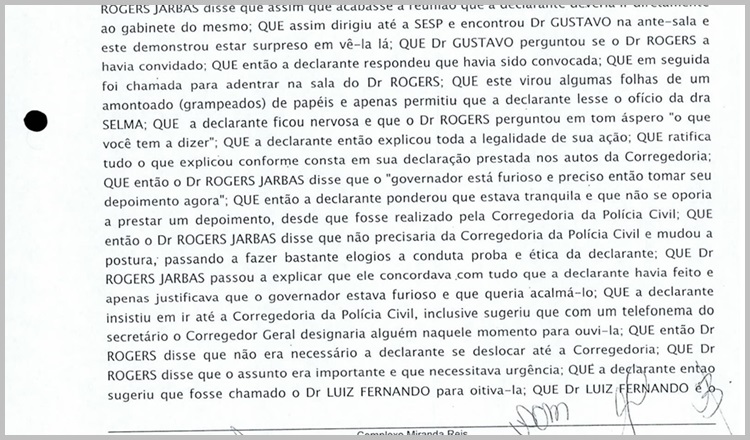 "Que então o Dr Rogers Jarbas disse que não precisaria da Corregedoria da Polícia Civil e mudou a postura, passando a fazer bastante elogios a conduta proba e ética da declarante; Que Dr Rogers Jarbas passou a explicar que ele concordava com tudo o que a declarante havia feito e apenas justificava que o governador estava furioso e que queria acalmá-lo; Que o Dr Rogers disse que o assunto era importante e que necessitava de urgência; Que então Dr Rogers determinou que a declarante fosse até a sala do Dr Gustavo Garcia [então secretário adjunto de Segurança] e que fizesse as declarações e que ao final era para chamá-lo", diz outro trecho do depoimento.