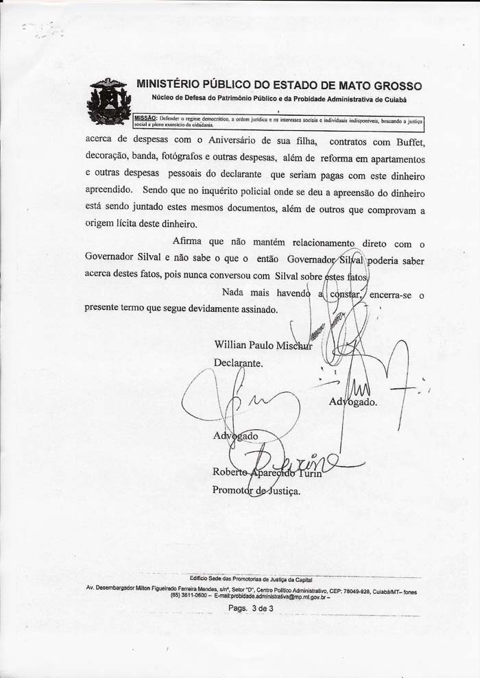 Ao final de seu depoimento, Mischur disse que não mantém relacionamento direto com Silval Barbosa - e que não sabe o que o ex-governador poderia saber acerca destes fatos, pois nunca conversou com ele sobre os mesmos.