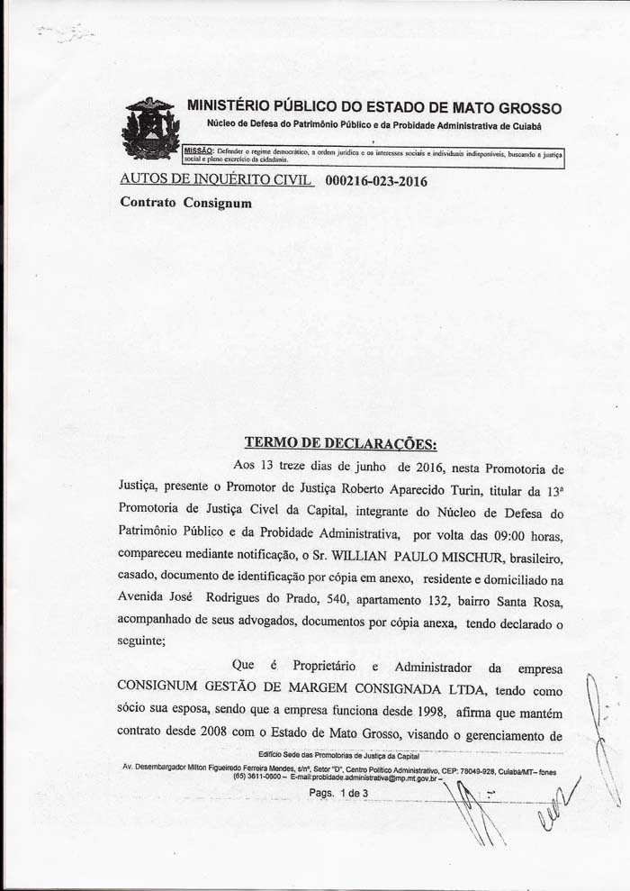 O promotor de Justiça Roberto Turin, do Ministério Público Estadual (MPE), tomou, no dia 13 de junho passado, o depoimento do empresário Willian Mischur, da empresa Consignum.