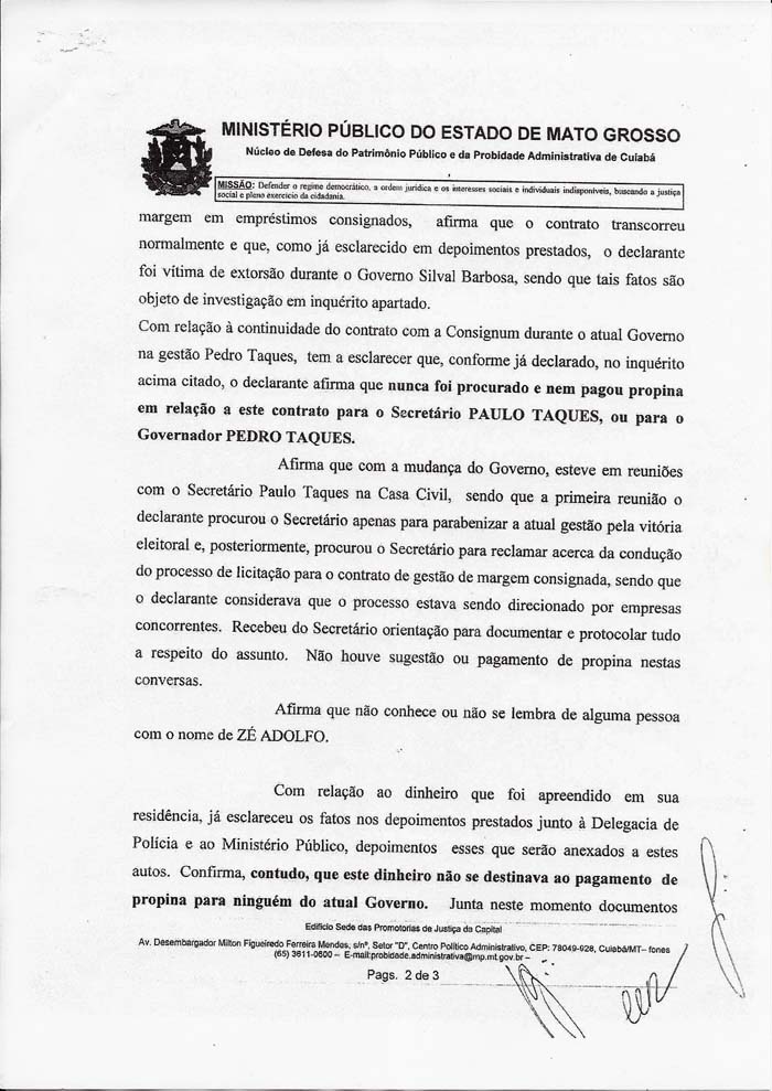 Ele negou ter pago propina a membros do Executivo. Ao MPE, o empresário disse que esteve em reuniões com o secretário Paulo Taques na Casa Civil.