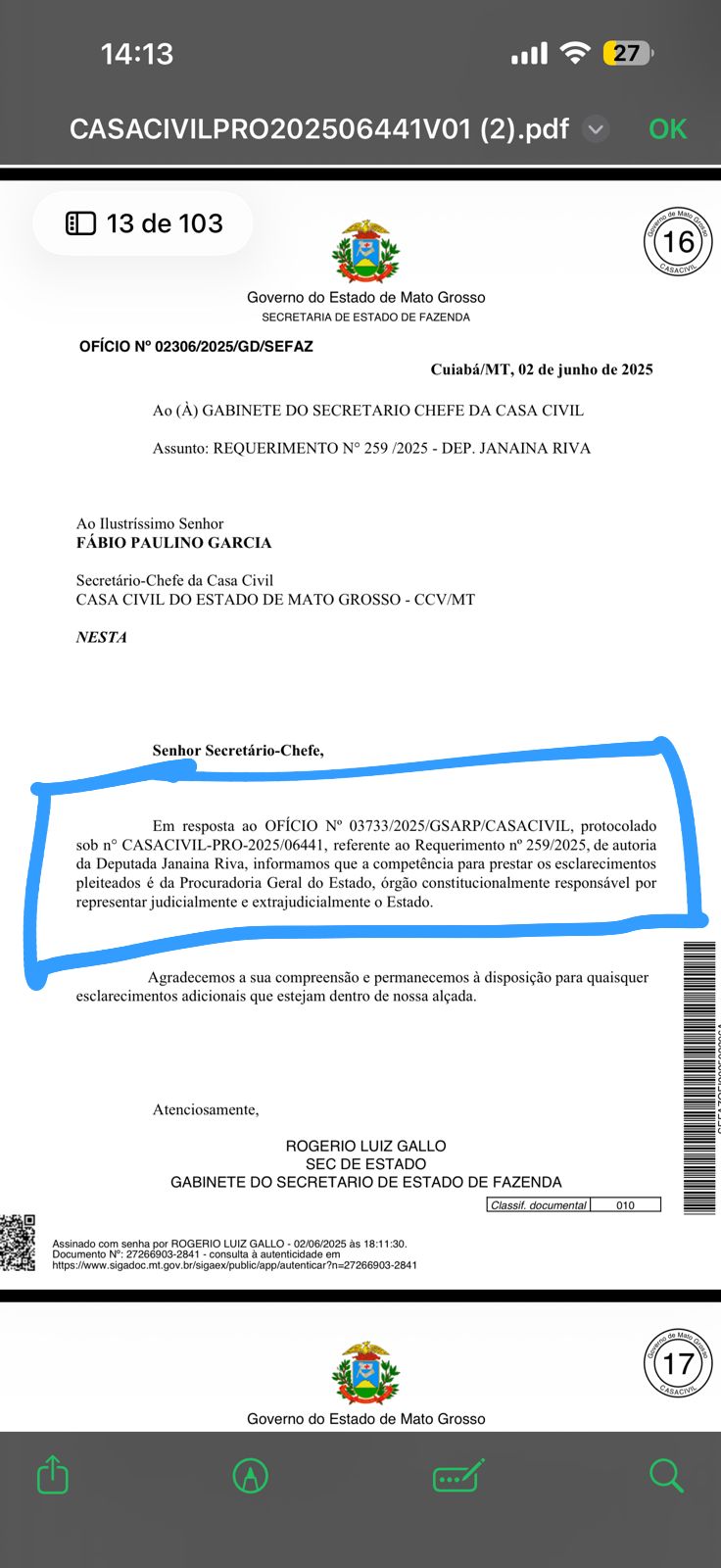 Na ocasião, a Secretaria de Estado de Fazenda (Sefaz) foi acionada e produziu nota técnica de cinco páginas apontando não ter competência constitucional para responder às questões, uma vez que essa é a função da PGE. No envio da resposta à Casa Civil, houve a substituição da nota técnica por um documento de uma página (anexo), com o mesmo conteúdo e sem qualquer prejuízo à resposta ao requerimento da deputada.
