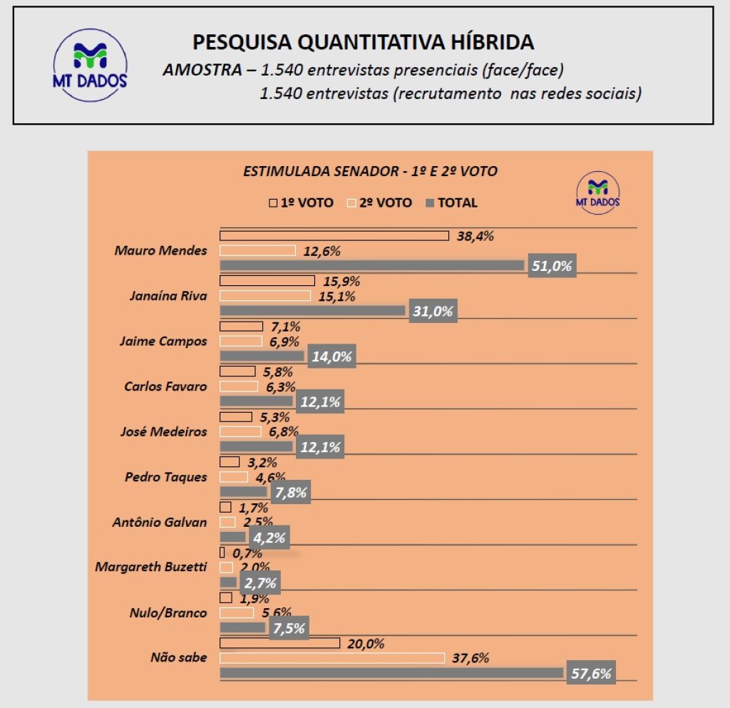 A deputada estadual Janaina Riva (MBD) aparece como a segunda mais votada com 31%. O senador Jayme Campos (União) registra 14% das intenções de votos, conforme o Instituto.
