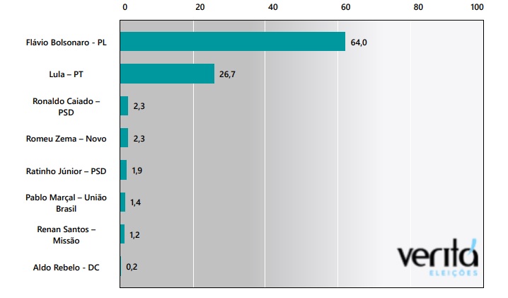 A pesquisa do Instituto Veritá, divulgada nesta quinta-feira (2), mostrou que o senador Flávio Bolsonaro (PL) é o favorito para a Presidência da República entre os mato-grossenses, com 64% das intenções de voto.