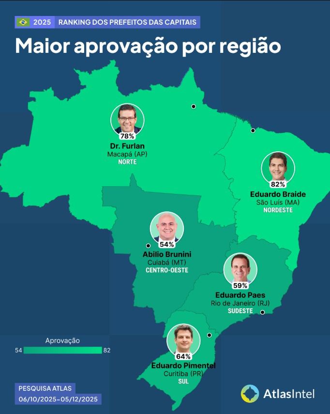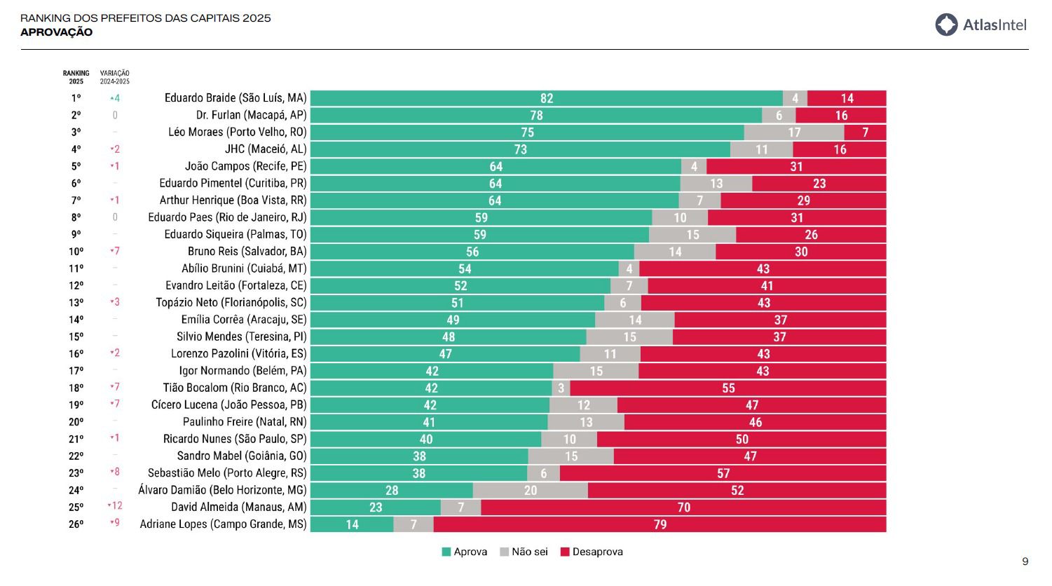 Além da aprovação, o estudo avalia a percepção geral sobre o desempenho administrativo das gestões municipais. Segundo a AtlasIntel, o ranking busca oferecer um instrumento técnico e comparável para medir como os prefeitos respondem às demandas locais e enfrentam os desafios da governança urbana.