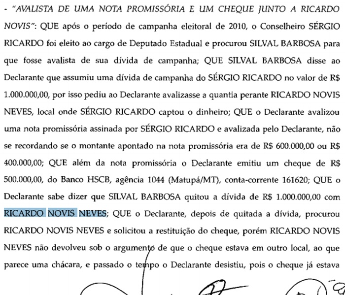 “(...) Que o declarante avalizou uma nota promissória assinada por Sérgio Ricardo e avalizada pelo declarante, não se recordando se o montante apontado na nota promissória era de R$ 600.000,00 ou R$ 400.000,00. Que além da nota promissória o declarante emitiu um cheque de R$ 500.000,00, do Banco HSCB, agência 1044 (Matupá/M1), conta-corrente 161620”, diz trecho da delação.