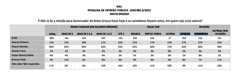 A segunda pesquisa feita pelo Instituto Ipec (ex-Ibope) em Mato Grosso mostra que governador Mauro Mendes (União Brasil) tem 63% das intenções de voto entre os católicos e 60% entre os evangélicos (confira gráfico abaixo).