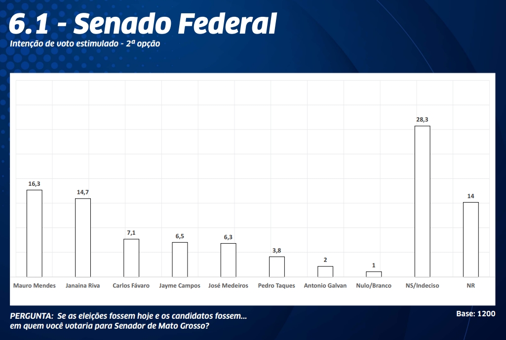 Já na segunda opção de voto, Mauro Mendes mantém a liderança, com 16,3%, seguido de perto por Janaina Riva, que aparece com 14,7%. Carlos Fávaro soma 7,1%, enquanto Jayme Campos registra 6,5% e José Medeiros, 6,3%.