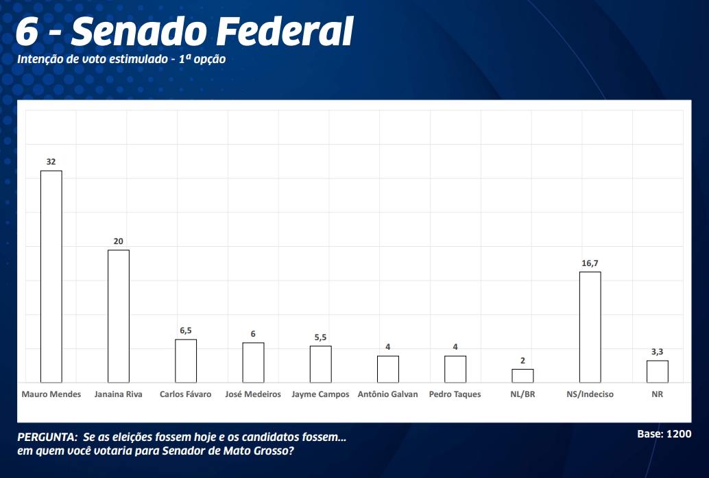 Na primeira opção de voto, Mauro Mendes aparece com 32% das intenções, seguido pela deputada estadual Janaina Riva (MDB), que registra 20%. Em terceiro lugar estão o ministro da Agricultura, Carlos Fávaro (PSD), com 6,5%, e o deputado federal José Medeiros (PL), ambos com 6%.