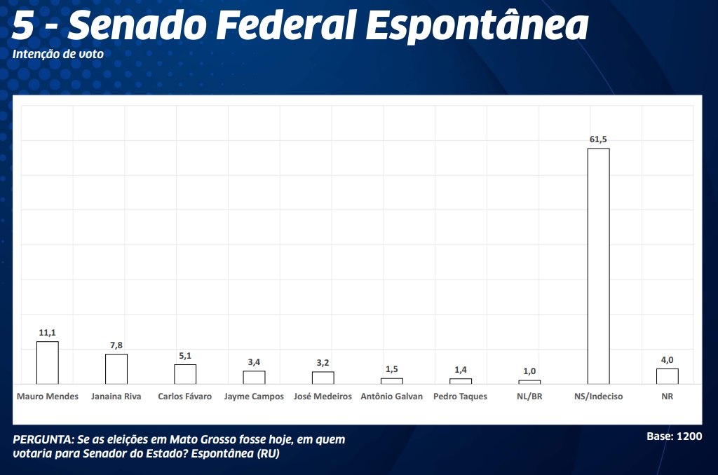 Na pesquisa espontânea, quando os nomes dos possíveis candidatos não são apresentados aos entrevistados, Mauro Mendes também apareceu na frente, com 11,1% das intenções de voto. Janaina registrou 7,8%, seguida por Fávaro, com 5,1%.