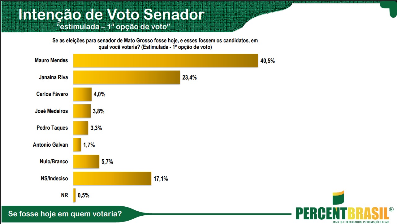 Novo levantamento da Percent Brasil, divulgado nesta segunda-feira (23), mostra o governador Mauro Mendes (União) liderando isolado a corrida ao Senado Federal, na eleição agendada para outubro deste ano.