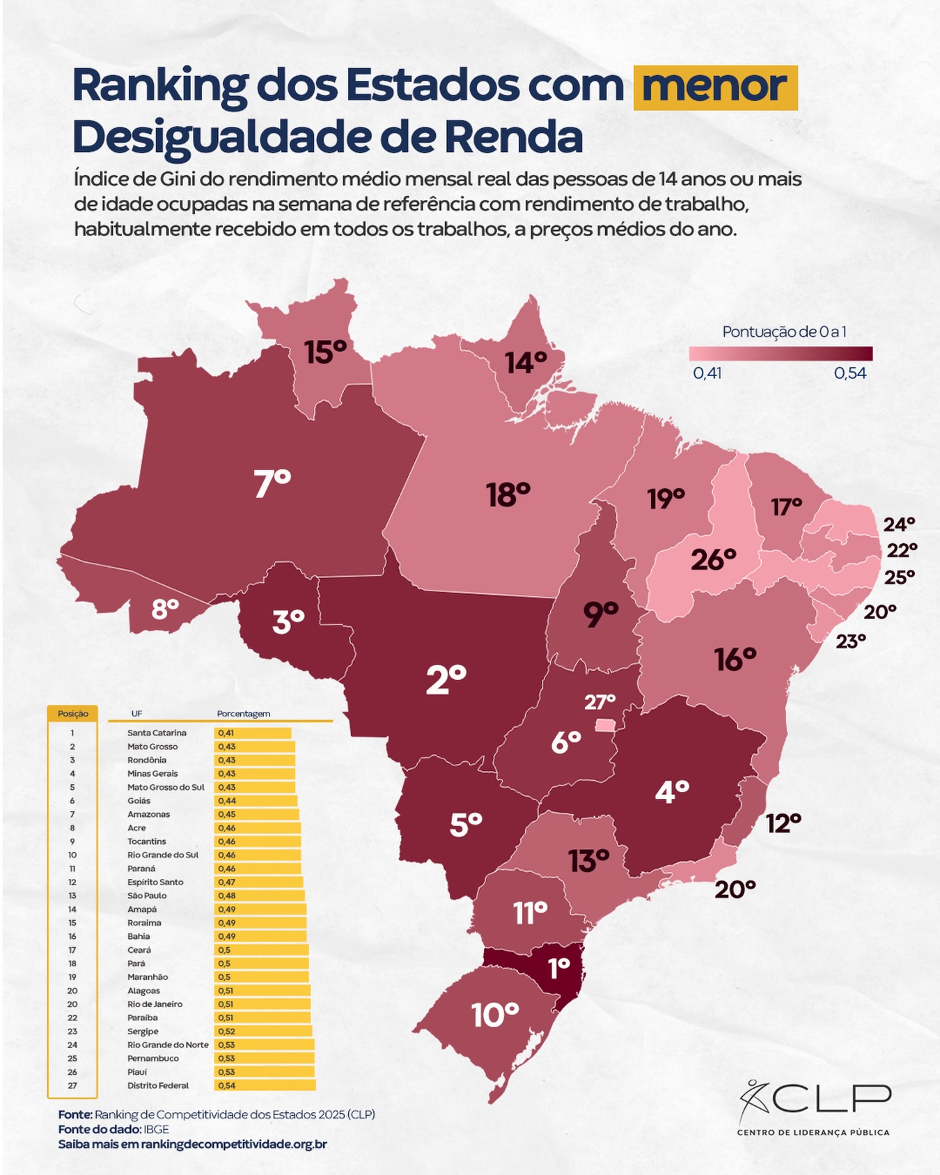 O governador de Mato Grosso também costuma publicar o ranking do CLP de competitividade dos Estados do Brasil. Nele, o Estado está 10º lugar, segundo o relatório de 2025. O ranking de desigualdade de renda compõe o indicador dos Estados.