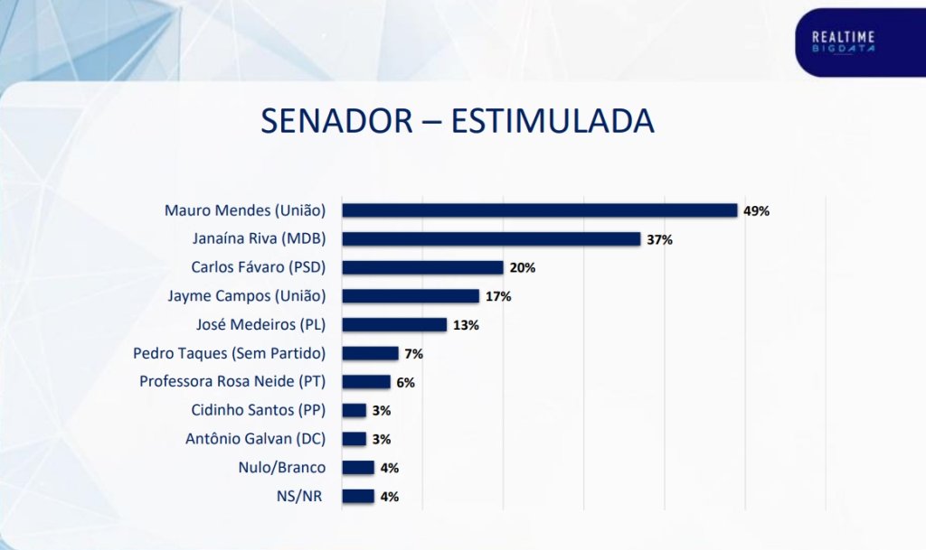 O governador Mauro Mendes (União) e a deputada estadual Janaina Riva (MDB) são os favoritos na disputa ao Senado, segundo pesquisa do instituto Real Time Big Data, divulgada nesta segunda-feira (3). Mendes tem 49% e a deputada 37%.