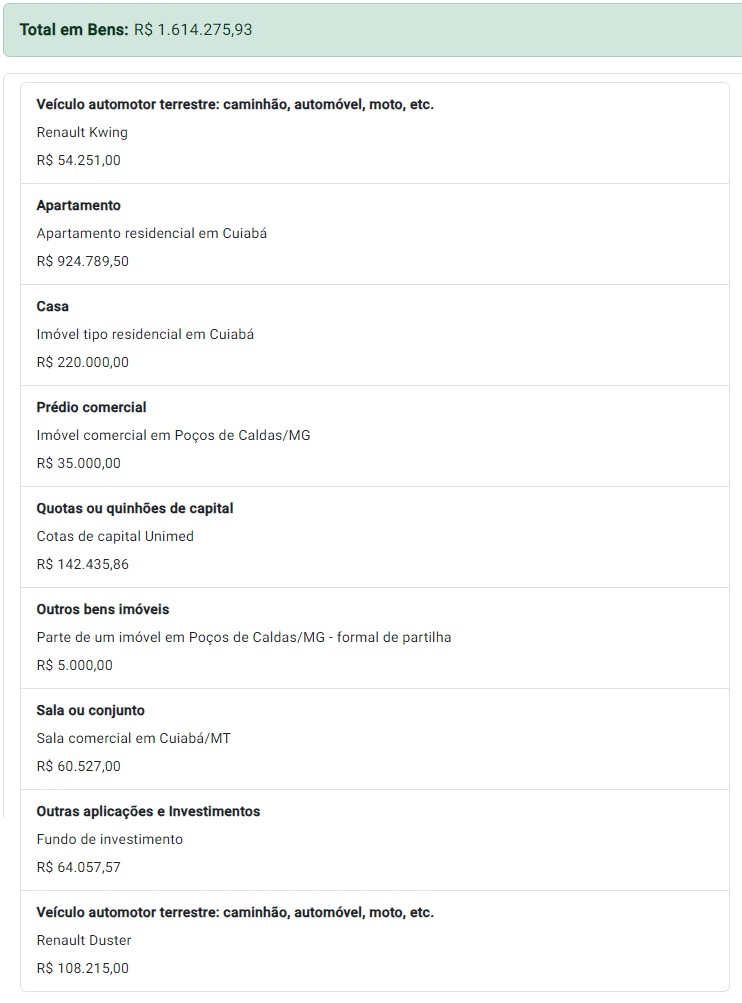 O médico disse ter uma sala comercial em Cuiabá estimada em R$ 60,5 mil; um apartamento residencial em Cuiabá de R$ 924,7 mil e uma casa em Cuiabá R$ 220 mil. Em fundos de investimento, ele disse ter R$ 64 mil.