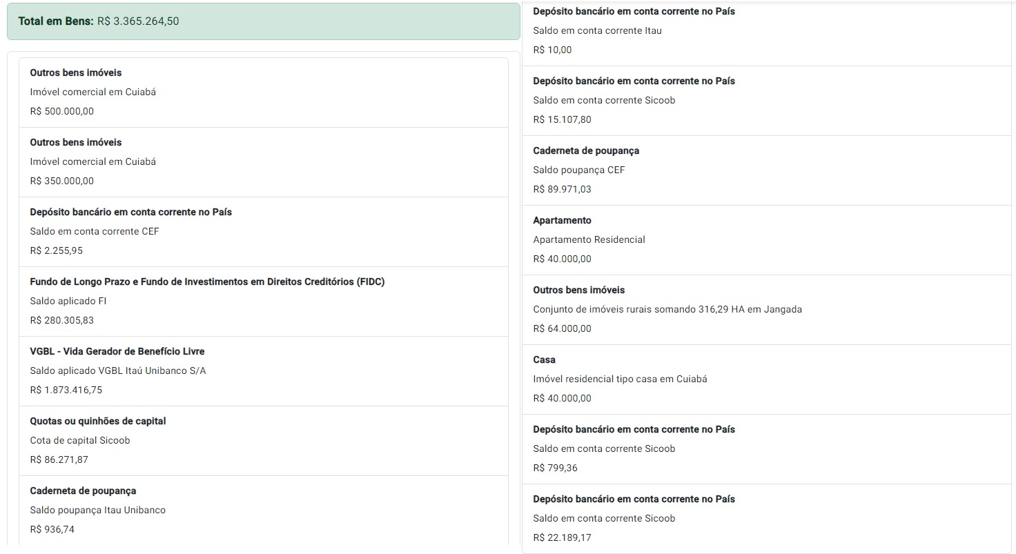 Em imóveis, o candidato declarou ter dois prédios comerciais em Cuiabá, um avaliado em R$ 350 mil e outro em R$ 500 mil. Todos os valores são venais, ou seja, não significa que são os valores praticados no mercado.