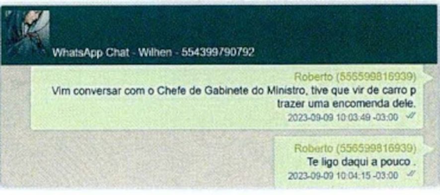 “Vim conversar com um chefe de gabinete do ministro. Tive que vir de carro para trazer uma encomenda para ele. Te ligo daqui a pouco”, enviou Zampieri ao lobista, no que a PF acredita ser uma entrega de valores em espécie.
