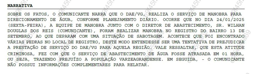 Também no dia 25, outro boletim apontou a colocação de pedras no registro de abastecimento do Bairro 13 de Setembro, o que atrasou em uma hora a distribuição de água. Wilhan disse a Polícia Civil que classifica o ato como “sabotagem”.